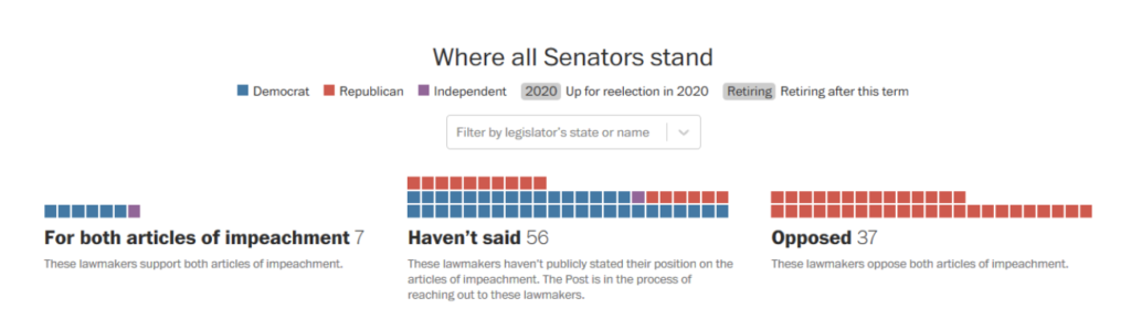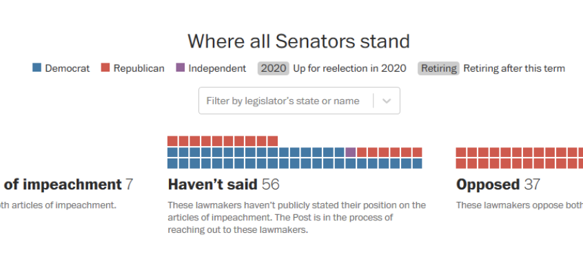 In what I’m sure the editors thought would be a move to prove the President’s doom in the Senate, the Washington Post put out a whip survey to members of the Senate on their intention to vote for or against impeachment. As of 7:00 am the morning after the House vote – the results seem to not look great for “removal” hopefuls.