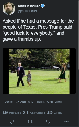 However, even Politico reported that “Trump plans to visit Texas early next week in response to Hurricane Harvey,” while the Washington Post stated “Trump’s focus on Hurricane Harvey intensifies as monster storm approaches Texas.”