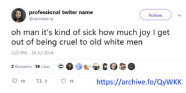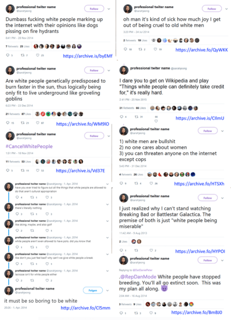 Yesterday, they proved even that is too much to ask when they hired Sarah Jeong. Sarah’s history of anti-white, anti-male sentiment are published for all to see on twitter.