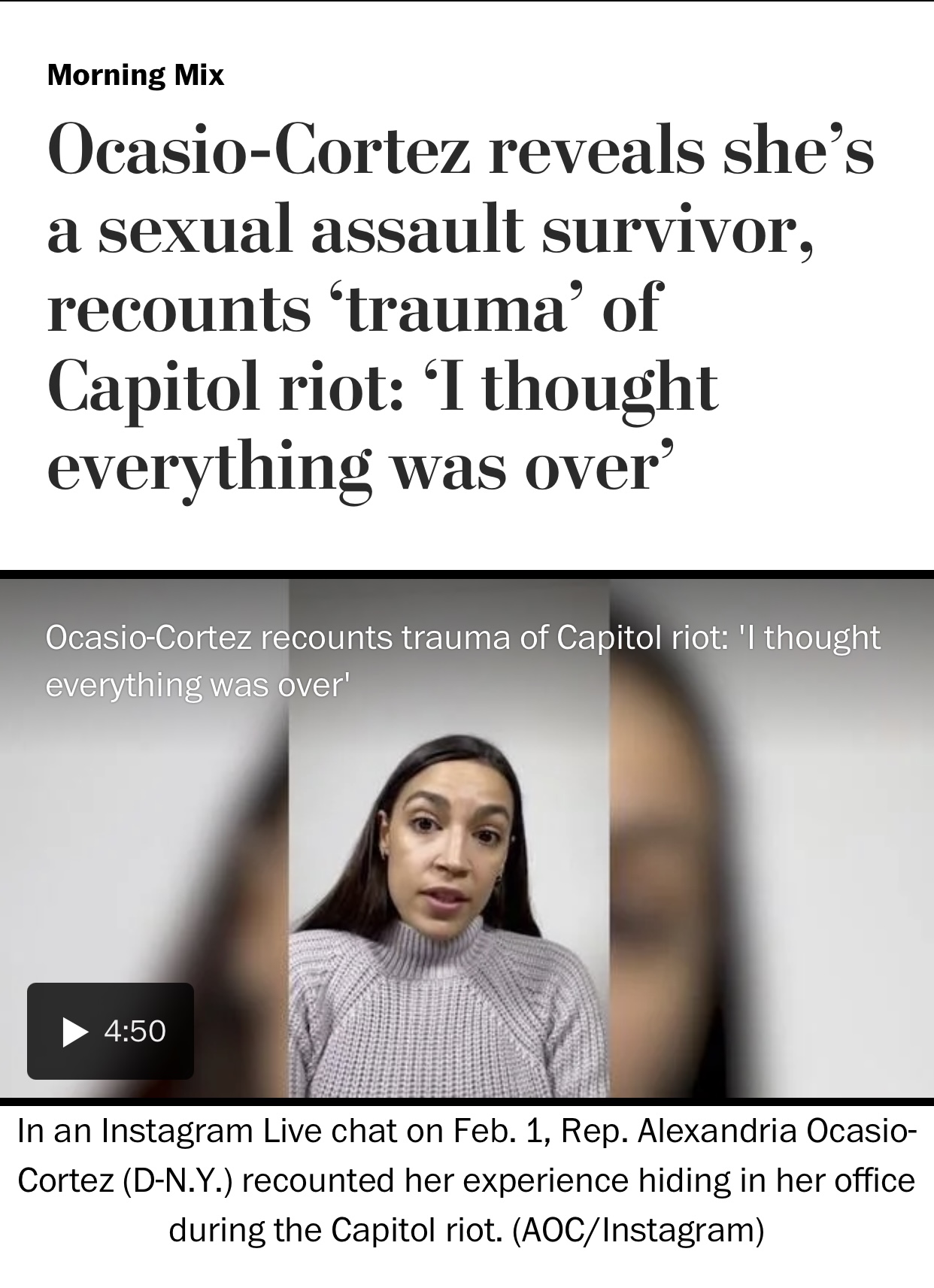 It hurts my story and stories like mine (the hundreds and the thousands way worse than mine) when women like AOC use their stories for political advantage or posturing. It makes our stories seem false. It makes them seem convenient. AOC has set back thousands of women by revealing her assault in the way she did. She has put us in the position, like now, of having to share our personal histories in order to have the credibility to confront her on her truly selfish, absurd and deplorable assertion that Ted Cruz and Josh Hawley’s opposition to characterizing the Capitol riots as attempted murder is the same as being a rapist.