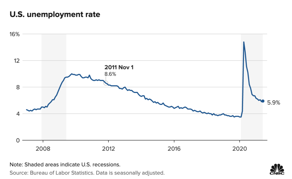 Unfortunately, the unemployment rate rose to 5.9%, which was more than the predicted 5.6% rise. This is most likely due to the continued unemployment benefits favored by the Biden administration.