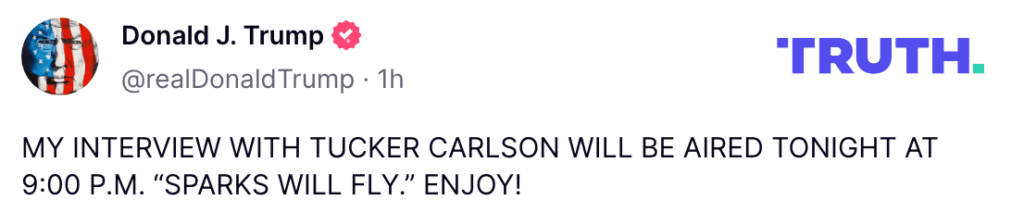 Former President Donald Trump revealed on Wednesday morning that he will be appearing in an interview with former Fox News host Tucker Carlson. The interview is set to be broadcast at 9 p.m., coinciding with the Republican National Committee’s initial primary debate.