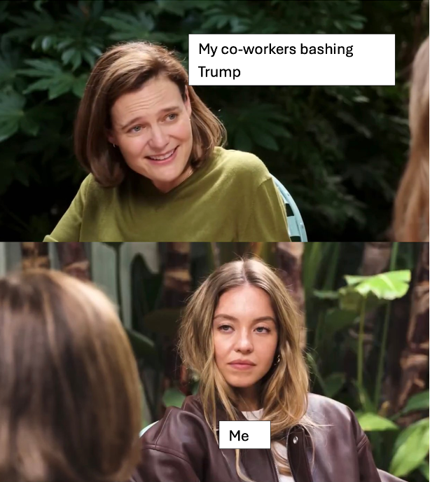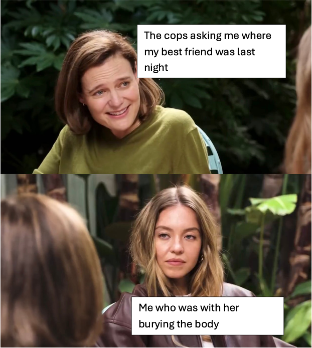 Truly an iconic response from Sweeney who has taught us all a masterclass on how to dismiss someone’s ridiculous shame ritual of forcing an apology tour for something that was never wrong in the first place. Not only did Sweeney not write the ad, she also never said or did anything racist. So to apologize for some perceived possible maybe slight “in this climate” is an absurd thing to be asked to do. And the meme was born.
