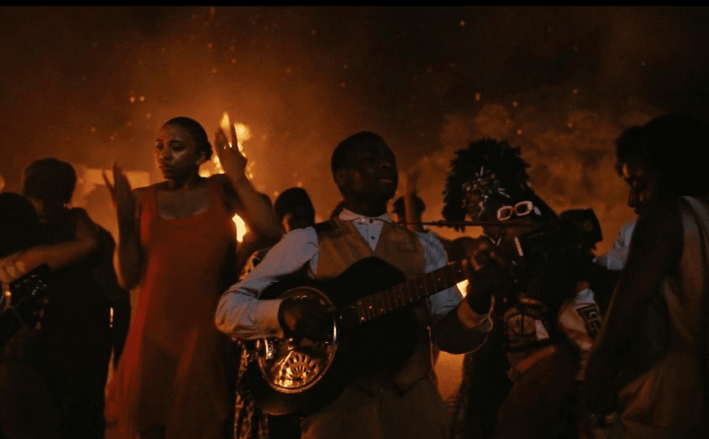 The cinematography is beautiful and it’s innovative in that it actually uses vintage movie magic. There’s a scene where the protagonist is playing a song at a party and his playing and his guitar connects him spiritually to his ancestors and the music of his ancestors. This is a running theme of the film and the scene is beautifully shot with stunning costumes and choreography that sets the setting literally on fire. It’s truly a spectacle. The treatment of music both from black and white ancient culture is powerful and unifying. Where many took away only negativity about race relations from the film, I personally saw a lot of effort to demonstrate what binds us spiritually. The antagonists are drawn to the protagonists by the music and play their own music in a very similar fashion to connect the group together through ancestral bounds. The concept is not only new (to me at least) but also beautiful.